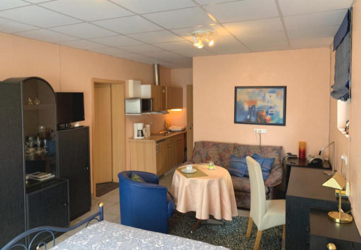 Bettwäsche, Bad, Kochnische, Geschirr, Schreibtisch, Essplatz