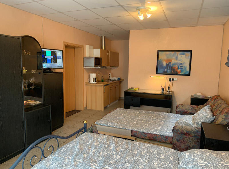 Bettwäsche, Bad, Kochnische, Geschirr, Schreibtisch, Essplatz